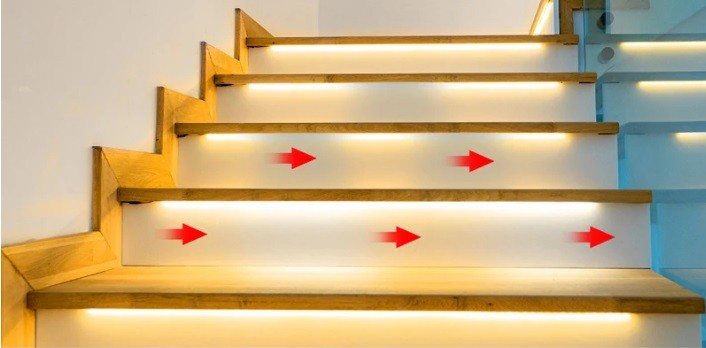 Dzięki wykorzystaniu sterownika schodowo korytarzowego F25 i taśm cyfrowych możemy w prosty sposób wykonać animowane podświetlenie stopni schodów, korytarza lub klatki schodowej. Do ustawienia sterownika niezbędny jest pilot dotykowy FUT092 . W celu zapewnienia jeszcze większego komfortu proponujemy dokupienie czujników zbliżeniowych FS1 w kolorze białym lub FS1 w kolorze czarnym
