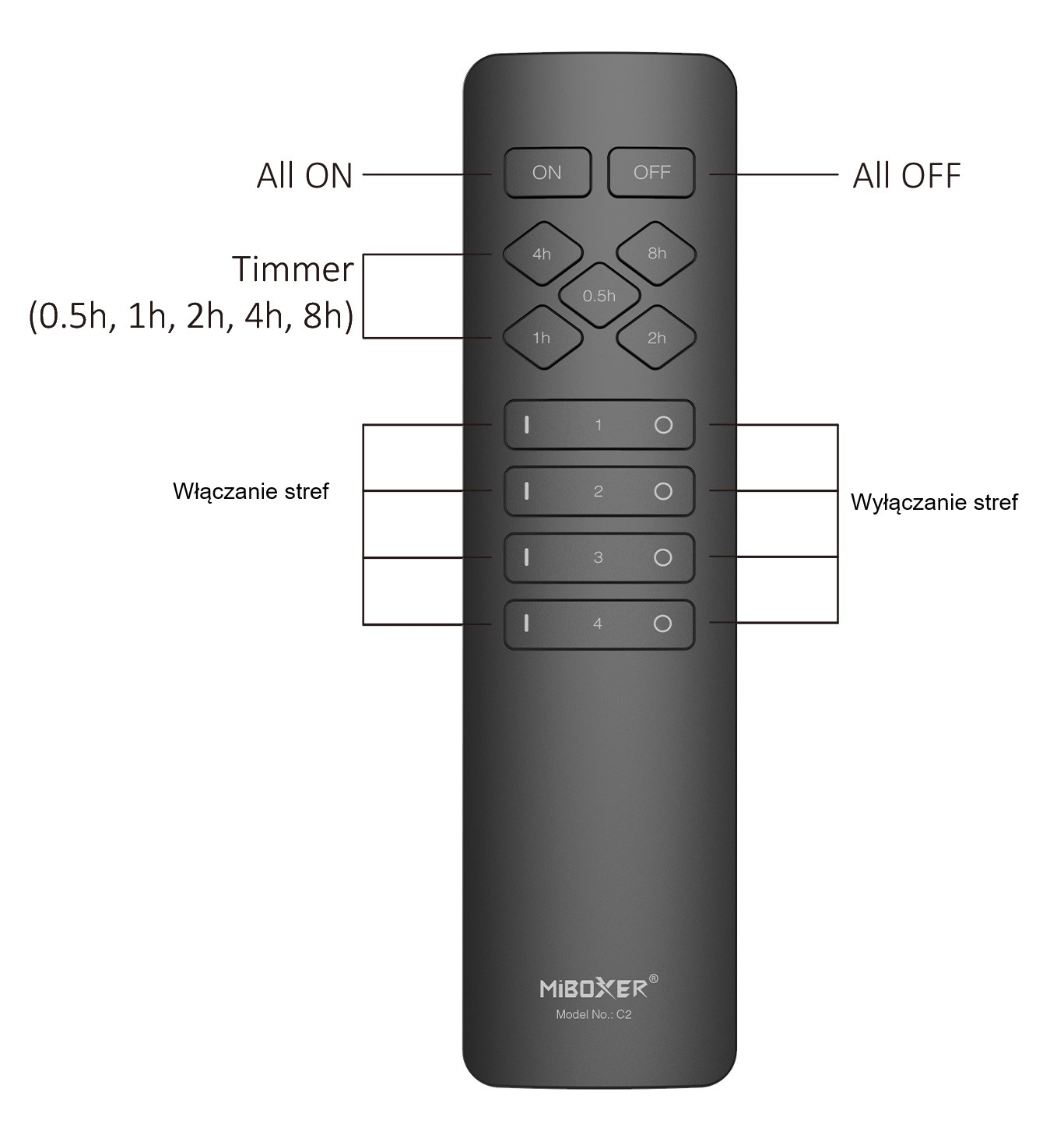 Pilot Mi-Light C2 to uniwersalny, przenośny kontroler z przyciskami manualnymi, przeznaczony do zdalnej kontroli nad włącznikami Smart 230V firmy Mi-Light oraz MiBoxer. Jest to pilot radiowy pracujący w systemie 4-strefowym, pozwalający na indywidualne i bezprzewodowe włączanie każdej z grup. Dzięki zastosowaniu najnowocześniejszej technologii (komunikacja radiowa 2,4GHz) zasięg pilota C2 to aż 30 metrów, więc umożliwi Ci sterowanie oświetleniem w całym mieszkaniu, biurze czy firmie z jednego miejsca.